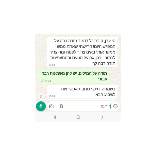 הכל נמצא אצלך, המקום שלי הוא לאפשר לך לבחור מתוך אפשרויות שמתאימות לך, ולמצוא יחד את המעקפים במקומות בהם אתה לא יכול לפעול